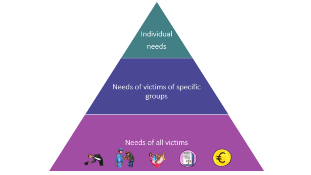 When considering victims’ needs, it is important to acknowledge that there are needs common to all victims (e.g. recognition), there are needs of victims of specific groups (e.g. older/younger people, people with disabilities), and there are individual needs of each victim (e.g. personal situation).